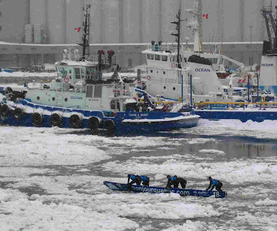 Des courageux canotiers traversent donc le Saint-Laurent à moitié gelé (d'énormes plaques de glace dérivent emportés par le courant) en pagayant quand c'est possible et en poussant le canot par dessus les morceaux de glaces à d'autres moments. Autant dire qu'ils ont souvent les pieds dans l'eau, voir plus, des fois c'est juqu'à la taille car la glace est mélangé à de la sloche et ils s'enfoncent. En plus de ça, il neigeait, ventait en "tabernouche" et faisait bien "frette".